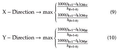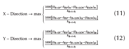 where δ(k+1)P is the lateral displacement of point P of story k + 1, δ (k)p is the lateral displacement of point P of story k, δ (k+i)CM is the lateral displacement of center of mass of story k + 1, δ (k)CM is the lateral displacement of center of mass of story k, and h(k+1+k) is the height between stories k + 1 and k.
