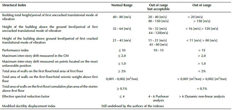 These structural indexes can be classified into two groups: stiffness indexes and structural redundancy and ductility demand indexes.
