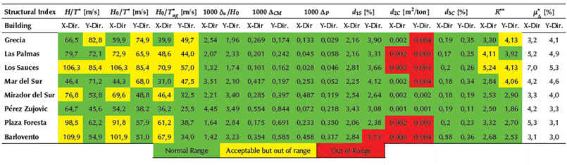Tables 3 and 4 show the results of the structural indexes for each selected building, classified according to the ranges as normal, acceptable but out of range, and out of range.
