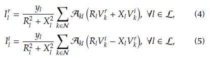 Second, the real and imaginary currents are defined as function of the voltage drops at the ends of each branch (Equations (4) and (5)).