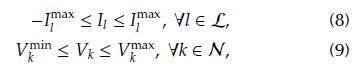 where I l max represents the maximum thermal limit of the conductor associated with branch l, and Vk min and Vk min represent the minimum and maximum voltage bounds allowed in all the nodes of the network.