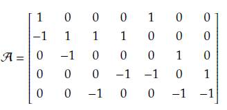 where it was assumed that the currents flow from the smallest to the highest by rearranging the columns from lines a to g and the rows from node 1 to node 5.