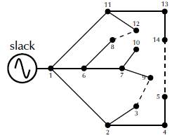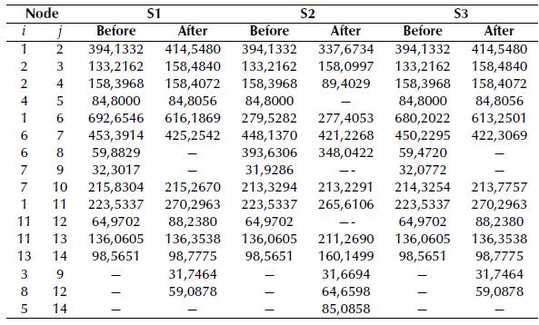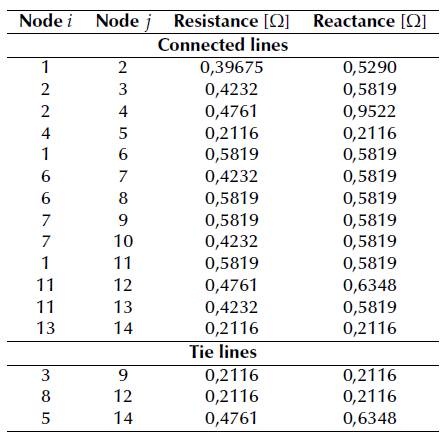 In this section, in order to demonstrate the efficiency of the proposed approach for the optimal reconfiguration of AC distribution systems, the classical medium voltage distribution network composed by 14-nodes and 16 lines reported in (Tapia-Juarez and Espinosa-Juarez, 2013) is employed (Figure 4). This system is operated at 23 kV, and the based power is assumed to be 1 000 kVA. The initial active power losses for this test feeder are 512,165 kW. The information on the connected and candidate branches is reported in Table 3, and the load information is listed in Table 4.