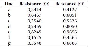 It is worth mentioning that lines e, f, and g represent the subset of possible links to reconfigure the AC distribution system by always guaranteeing a radial topology. In addition, the incidence node-to-branch matrix that represents this test feeder has the following structure: