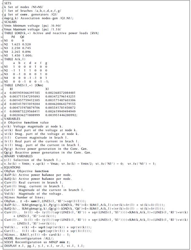 This section presents the optimization strategy adopted to solve the problem of the optimal reconfiguration of AC networks with an MINLP model described in Equations (1) to (10). To this effect, the general algebraic modeling system is used as a solution technique. The GAMS software is a powerful tool that allows solving complex optimization models including linear and mixed-integer programming, quadratic programming and general nonlinear programming models with mixed variables (i.e., binary, integer) (Soroudi,2017).