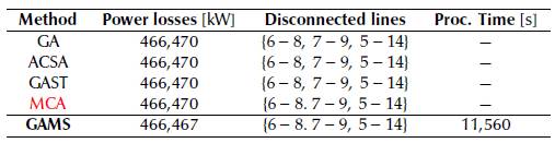 As for S3, the initial power losses considering the initial topology depicted in Figure 4 and a capacitive compensation of 6 MVAr at node 6 are 500, 697. Once the proposed methodology for optimal reconfiguration in AC networks is solved through GAMS, the resulting power losses are 463,039 kW, which means a reduction of 7,52% with respect to the initial case. Note that the disconnected lines are {6 - 8, 7 - 9, 5 - 14}, which agrees with the optimal solution for S1. In this problem, the GAMS package takes about 6 s to find the optimal solution, which confirms its effectiveness at analyzing complexMINLP models (Soroudi, 2017).