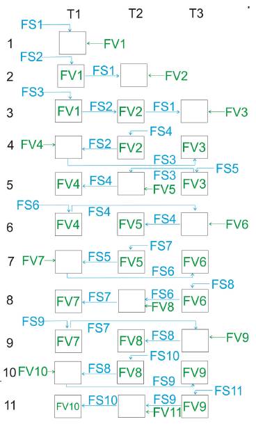 The number on the left in Figure 4 was called 'period' and corresponds to a five-minute interval for extraction plus the time taken by the respective transfers. T1, T2, and T3 refer to the three agitated tanks, FV is the fresh vegetal, FS is the fresh solvent, and the accompanying number refers to the order in which the vegetable and solvent batches entered the system. Each batch of vegetable remains in the system for three periods and does not change tanks. Each solvent batch also remains in the system for three periods but is transferred as indicated by the arrows in Figure 4.