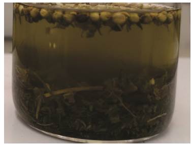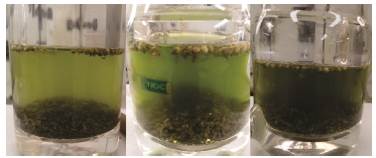 Initially, although it is a qualitative measure, and it is associated with the amount of chlorophyll extracted, the difference in color can give an idea of the way in which the extraction process progresses. Figure 5 shows the result of a lixiviation carried out with a single stage at 19 °C for 20 min.