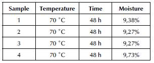 Although the product is described as dry by the supplier, drying tests were carried out on the biomass. The results shown in Table 1 indicate that the average moisture is 9,41%.