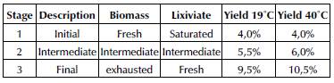 For the lixiviates of the three stages of period 11, the percentage of extracted mass was calculated for the processes at 19°C and 40°C. The results are shown in Table 2. The initial stage refers to the tank in which the fresh vegetal is in contact with the oldest lixiviate (this liquid leaves the process). In the intermediate stage, there are both vegetal and lixiviate that have already passed through a stage, and, in the final stage, the exhausted vegetal (which has remained longer in the process and will leave it at the final period) and fresh absolute ethanol come in contact.