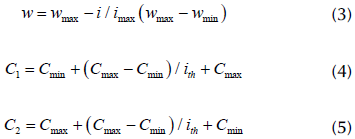 According to Li et al. (2019), the implementation of an adaptive inertia coefficient (w) allows the particle population to adjust more precisely and quickly the exploration of the optimal solution, reducing the search times for particular and global values in the conventional implementation of the PSO algorithm. On the other hand, the variation in the acceleration coefficients is used to improve the speed of convergence towards the optimal global solution, thus allowing to reach this solution efficiently. Z. Tang and Zhang (2009) proposed a temporal variation of the acceleration coefficients in order to improve the exploration of the global optimum in the first stage of the optimization process and thus facilitate the convergence of the particles towards it. Equations (3)-(5) describe this proposal.