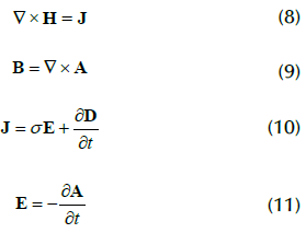 where H is the magnetic field, J is the electric current density, B is the magnetic flux density, A is the magnetic vector potential, E is the electric field, σ is the electrical conductivity, and D is the electric displacement field.