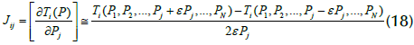 where J is the sensitivity matrix, i is the time instant, j is the number of the parameter, and ε is the perturbation of the parameter, represented at 10% of its nominal value.