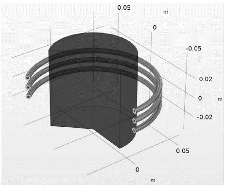 The physical problem considered in this work involves a cylindrical domain with the physical properties of human muscle. The heating is generated using RF through a copper coil of three spirals with a radius of 8 mm and a cross-section of 70 mm, as presented in Figure 1. The heat in the domain is due to the electrical and magnetic loss of the therapy. The boundary conditions for the material are considered to be convective heat flux in the lower and upper surfaces and adiabatic boundary conditions around the domain. The solution of the direct (forward) problem was obtained using COMSOL Multiphysics® 5.3 and verified against the results presented by Hand et al. (1982) and Paruch and Turchan (2018). These processes were performed on a computer with 16 GB RAM and an i7-9750H processor.