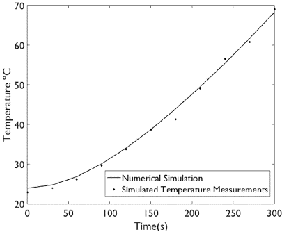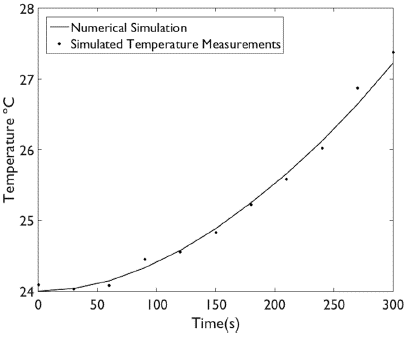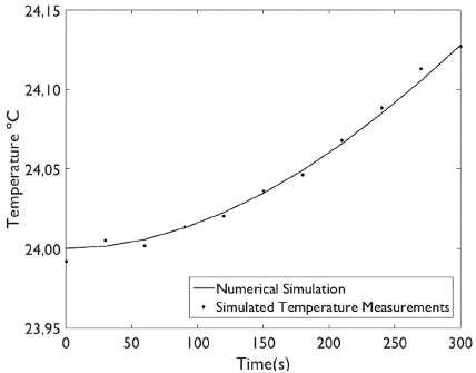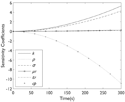 Figure 5 shows the behavior of the sensitivity coefficients of k (thermal conductivity), ρ (density), σ (electrical conductivity), μ r (relative permeability), εr (relative permittivity), and cp (heat capacity). Note that those of μ r and £r have small magnitudes, indicating a low influence on the temperature field, and the remaining parameters exhibit linear dependence and large magnitudes. This behavior reveals that a single parameter can be estimated. As mentioned in this paper, electrical conductivity was estimated despite the limited information on this parameter in the literature.