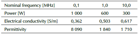 To establish the appropriate frequency and power to perform RF hyperthermia, it is necessary to consider the thermal dose in the treatment. Experimental studies have revealed that patients are comfortable when the heating rate is 1,0 °C/min, which does not cause considerable pain or severe damage (de Oliveira, 2014). In this study, the mean rate at 0,1 MHz was 0,02 °C/min and 0,64 °C/min at 1,0 MHz. These rates are suitable for performing mild RF hyperthermia therapy. For the case of 10,0 MHz, the rate was 1,8°C/min, which does not allow performing therapy. However, it is possible to modify the power to reach an adequate thermal dose, e.g., a frequency of 10,0 MHz at 100 W in approximately 9 minutes (López and Bermeo, 2021).
