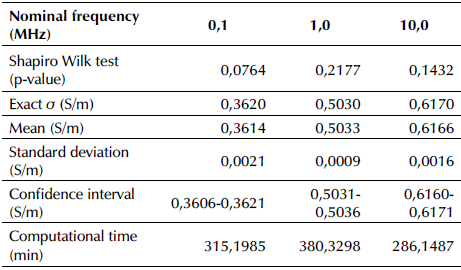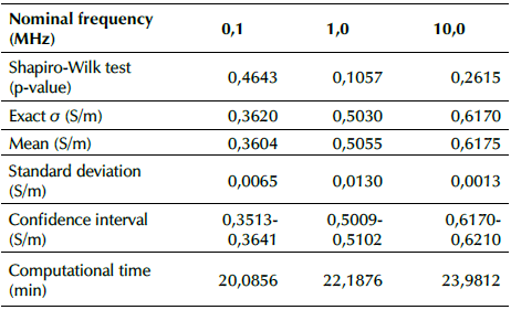 The LM method was implemented with three different frequencies and powers (Table 1). The method was executed 50 times, and a statistical analysis was conducted in order to determine the electrical conductivity. The stopping criterion was likelihood. The study included the Shapiro-Wilk test (Shapiro and Wilk, 1965). Then, the mean, the standard deviation, and a confidence interval of 95% were calculated. Table 3 summarizes the estimation values. Note that the p-value in the Shapiro-Wilk test for the total cases is higher than 0,05, indicating that the results of 50 performances correspond to a normal distribution. In this sense, the estimation of electrical conductivity was represented by the mean, observing that the value was very close to the exact value, which indicates that the method accurately performed the estimation. Concerning the confidence interval, note that the exact and estimated values are within this interval.