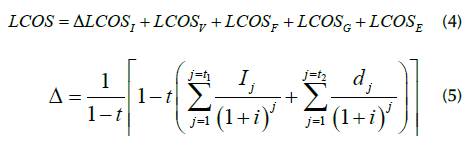 Law 1715 of 2014 encourages investment in projects involving non-conventional energy sources (NCES) through four tax incentives (Ley 1715 de 2014), namely 1) a deduction of up to 50% of the investment through income tax during the first five years of operation (Investment Tax Credit, ITC); 2) exemption from VAT on national or imported equipment, elements, machinery, and services that are destined to the pre-investment and investment of NCES; 3) exemption from the payment of import on the previously named components; 4) an accelerated depreciation of assets, which will not be greater than 20% per year as a global rate. Nevertheless, under the National Development Plan 2018-2022, the ITC can be exercised during the first fifteen years of operation. Therefore, the concept of the tax factor (A) is applied to evaluate the effect of tax incentives on LCOS. Equations (4) and (5) show the modified LCOS considering tax incentives (López-Lezama et al., 2017). Thus, A is a factor affecting the initial investment cost of the project, and it stems from the tax incentives given by Law 1715 of 2014.