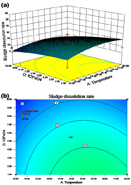 Figure 3: Response surface (a) and contour (b) maps: potassium ferrate dosage and temperature