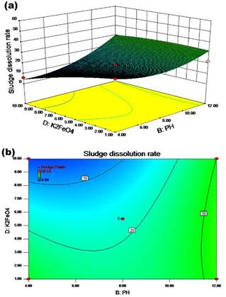 Figure 5: Response surface (a) and contour (b) maps: potassium ferrate and pH value