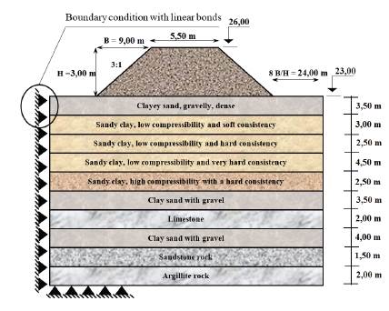 The distance from the toe of the slope to the boundary condition was established from previous studies to determine the subdomain model (Mesa et al., 2016). The analysis of the influence of stress in the area of crown and core of previous studies determined that the distance most useful for modeling road embankments is eight times the ratio of the base of the slope and height of the embankment,. Linear bonds are used as the boundary condition (Figure 4) (Mesa et al., 2016).