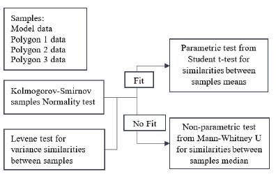 However, this paper presents another way to calibrate the numerical model through the determination of similarities between two independent samples by means of statistical hypotheses. Table 7 shows the K-S test for polygons and the model, where no data fits the normal distribution, since the P-value was less than 0,05.