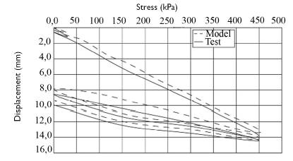After the test was modeled, the results of the soil strain by the load system were represented graphically as stress-displacement curves for both the model and the test (Figure 10).