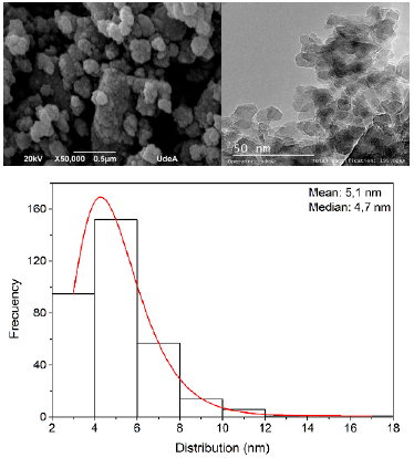 The alumina used to synthesize the MSBNFs was obtained from clay minerals by means of an acid leaching process, followed by alkaline precipitation and an acidification process, to finally calcine and obtain mainly delta-gamma alumina with 98,5% purity. The complete procedure was reported by Botero et al. (2020). Figure 2a and 2b show the SEM and TEM images of the pristine alumina nanoparticles used to elaborate the MSBNFs, respectively, and Figure 2c shows the size distribution (average size of 5,1 nm). The regular shape can be observed in the SEM and TEM images.