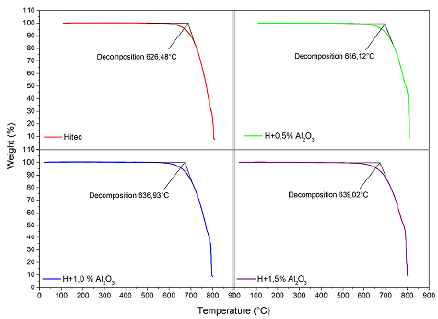 Table 2: TGA results for HITEC and MSBNFs with 0,5, 1,0, and 1,5 wt.% of alumina nanoparticles under a nitrogen atmosphere