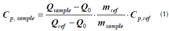 The specific heat capacity of HITEC molten salt and the MSBNFs was measured using two different methods. The first method involved using the traditional differential scanning calorimeter (DSC; Q200, TA Instrument, Inc.) according to the ASTM E1269 standard (ASTM International, 2011). The samples were heated to 250 °C and held at this temperature for 5 min in order to obtain a stable heat flux signal, after which they were again heated to 350 °C at a rate of 20 °C/min. The specific heat of the sample was obtained according to (1), where mref and mSample are the standard reference and sample masses, respectively: