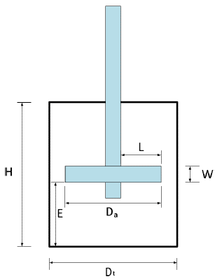 Empirical geometric proportions of the tank and agitator, which are illustrated in Figure 2, were taken into account for the paddle-type and turbine-type agitators shown in Table 1, where D a is the propeller diameter, D t is the water tank diameter, W is the width of the propeller blade, H is the water tank height, and E is the height of the propeller with respect to the water tank bottom. Dimensions were measured using a caliper with an error of ±.