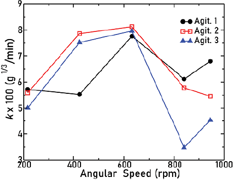 Note how, for ω ≤ 632 rpm, the value of k increases. For agitator 1, the difference between the two first dissolution constant values is so small (around 3%) that we can assume that the k remained constant. However, for higher values of co, a decrease with respect to the maximum achieved dissolution constant is found, which is a characteristic of the three types of agitators. This behavior can be attributed to the fact that, for ω > 650 rpm, vortex and high turbulence inside the beaker were experimentally observed, especially for agitator 3, which showed the highest drop in k. The combination of these effects could make the mass transfer between solute and solvent difficult and therefore produce a decrease in mass transfer during the diffusion process. From Figure 6, it is also possible to infer how, for ω < 632 rpm, the higher values of dissolution constants are obtained with agitator 2, which is the one that actually has its blades pitched, thus allowing an axial flow. For ω > 632 rpm, agitator 1 attains the highest rates of dissolution, presumably since it is the one which reported the least of turbulence. This led us to infer that the dissolution constant depends indeed on the geometry used in the agitation system.