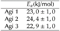 The activation energy was approximately the same for the three types of agitators used, regardless of their geometry. For the pre-exponential factors, a remarkable difference appeared among the agitators, which leads us to conclude that the geometry of the agitator can affect the kinetic constant specifically in the pre-exponential factor.