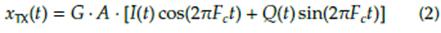 Figure 2 shows the block diagram of the proposed setup. Conveniently selecting I[n] and Q[n] input sequences (left) while varying carrier frequency (Fc) and adapting gain levels in (G, G1, and G2), we expected to produce controlled, time-and energy-bounded, frequency modulated pulses. The corresponding measures were used at the receiver antenna (RXA, I 1[n] and Qi[n], top) and the reference line (I2[n] and Q2[n], bottom) to assess absorbance levels.