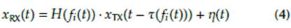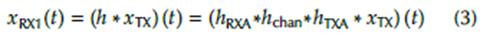 The operator * stands for the linear convolution, and h(t) represents the combined response of the channel (h chan) and antennas (h RXA, h TXA). Whenever the transmitted signal is a modulated pulse (sweep), the received signal may be reformulated as