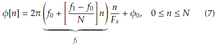One must select a suitable phase sequence ф[n] that corresponds to some frequency profile. The simplest one consists of a monotone. Alternatively, one may choose a linear or exponential sweep. Constant frequency is mainly affected by noise and distortion in the band, whereas exponential sweeps display convenient properties for modeling broadband channels, as discussed in (Blanco-Murillo and Yagüe-Jiménez, 2017). Linear sweeps present an excellent trade-off for linear processes and a simple formulation: