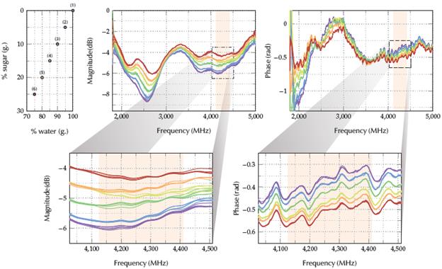 The 4125 to 4 410 MHz band showed very high significance levels in terms of magnitude and phase for both tests in prepared sucrose-in-water solutions. This band is also marked in Figure 4. It differs from the one identified by Coronel-Gaviro et al. (2020) for the detection and quantification of honey fraud (2 150 to 3 250 MHz). However, the authors reported on honey samples and only addressed magnitude levels.