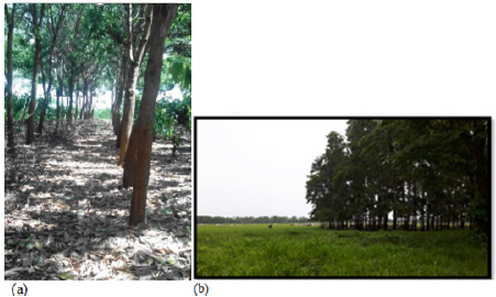 Figure 1: (a) Cocoa-based agroforestry including Acacia mangium trees; (b) silvopastoral system of B. decumbens pasture with Acacia mangium in the study area (Villavicencio, Colombia). The capacity of soils and biomass in agroforestry systems to store C depends on several factors, including local edaphic and climatic conditions, previous land use, tree density and species, harvesting and pruning practices, and management activities (Nair, 2012).
