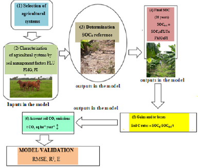 In general, the transition from cropland to an agroforestry system is beneficial to soil organic carbon (SOC) (Cardinael et al., 2018). The accumulation of SOC due to the sequestration of carbon in the soil is certainly one of the major benefits of agricultural systems, as it is effective in helping to mitigate the increase in atmospheric CO2 concentrations (Lal, 2018). For example, in the southeastern USA, conservation tillage, combined with intensive crop rotations that include cover crops, can sequester an average of 1 700 lb of CO2 each year, i.e., 464 lb of C per acre (Franzluebbers, 2015). There are various methods to estimate soil CO2 emissions from agriculture, ranging from simple Tier 1 methods (IPCC, 2006; Ogle, 2004; Parra et al., 2019) to complex process-based models that simulate the changes in soil carbon with some detail (Tiers 2 and 3) (FAO, 2018), although this relation is even more complex under the influence of climate change in tropical zones. Cardinael et al., (2018), applying a Tier 1 IPCC methodology, validated that the mean SOC storage rate (± confidence intervals) for croplands converted to agroforestry systems was 0,75±0,19 t C ha-1 yr-1, while the mean SOC loss rate for forests converted to agroforestry systems was -1,15±1,02 t C ha-1 yr-1, in all regions, climates, and agroforestry systems taken together. The mean SOC change rates for the conversion from grasslands to agroforestry systems were not significantly different from zero (0,23±0,25 t C ha-1 yr-1). In this sense, by employing soil management practices, agricultural lands can both sequester soil carbon and reduce GHG emissions (IPCC, 2006). Nemo et al., (2017) showed a variant of Tier 1 testing with the 2 RothC model (IPCC, 2006), which is used to simulate the interaction between GHG emissions, growth, and grazing in managed grasslands, where the C-input was adjusted so the equilibrium C matched the measured total SOC at the end of the spin-up period. This variant is useful for grassland systems in which the plant-derived carbon input is the most uncertain parameter, as well as the one to which the model is most sensitive (Poeplau, 2011). These types of approaches have been used to estimate C sequestration potentials in grasslands, as well as the potential effects of pasture management on SOC and stock changes on global, national, and regional scales (Henderson et al., 2015; Chambers et al., 2016; Novaes et al., 2017; FAO, 2018; Parra et al., 2019). Our specific objectives were the following: (1) to test the performance of the IPCC Tier 1 ensemble approach to simulate soil CO2 emissions; (2) to quantify differences in soil CO2 emissions between agricultural systems and zones across the Villavicencio area by modeling and measuring SOC according to the effect of soil management practices as a first approximation to national inventories; and (3) to assess the performance of the IPCC Tier 1 approach with parameters such as the RMSE, the Nash-Sutcliffe efficiency (NSE), and R2.