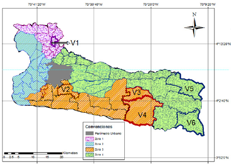 Figure 3: Map of the location of the sampling sites in the Villavicencio area: zone 1 includes Puente Abadía locality (V1); zone 3 comprises three localities: Barcelona (V2), Pompeya Alto (V3), and Pompeya Bajo (V4); and zone 4 has two localities: Indostant (V5) and Porvenir (V6).