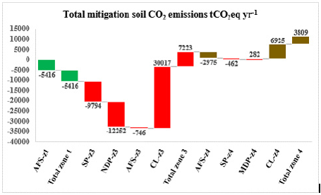 Figure 4: Contribution of soil CO2eq emissions and sinks in each land use category and zone across the Villavicencio area, which was computed (SOC rates tC ha-1 yr-1 x area (#ha) x 3,65) based on the changes in SOC storage reported in Table 4. Soil CO2 emissions are negative in the face of stored SOC and positive with released SOC. Legend: AFS: agroforestry systems; SP: silvopastoral systems; NDP: non-degraded pastures; CL: cropland; MDP: moderately degraded pasture; z: zone.