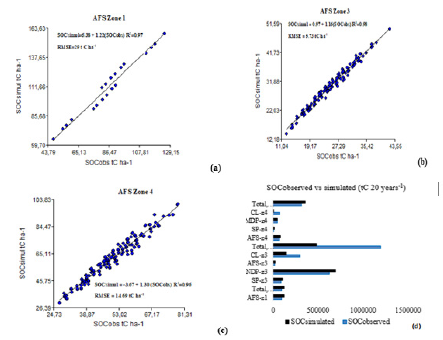 Figure 5: a) Relationship between observed and simulated SOC for AFS, zone 1; b) relationship between observed and simulated SOC for AFS, zone 3; (c) relationship between observed and simulated SOC for AFS, zone 4; d) relationship between observed and simulated SOC (tC 20 years-1) for the agricultural systems in Table 5 (total ha). Legend: AFS: agroforestry systems; SP: silvopastoral systems; NDP: non-degraded pastures; CL: cropland, MDP: moderately degraded pasture; z: zone.
