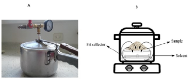 Fat extraction with pressurized solvent: An extraction technique involving a pressurized solvent (Figure 1a) was implemented for the fat extraction procedure. A sample holder was incorporated to this effect, as well as a container used to collect the extracted fat. The solvent was deposited at the bottom, outside of the grease collection container (Figure 1b).