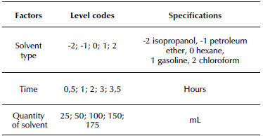 According to the experimental design, between 25 and 175 mL of isopropanol (-2) solvent, petroleum ether (-1), hexane (0), gasoline (1), and chloroform (2) were added to the pressure system. Later, 100 g of tallow were added to the sample holder, and the container was hermetically sealed and heated to a pressure of 103,4 kPa. The extraction was carried out in intervals from 0,5 to 3,5 h according to the experimental design. Finally, the employed solvent was released using the lid valve, and it was recovered from the condensation for later use. The lid was removed, as well as the sample holder from inside the pressure system. The extracted fat was deposited in a beaker and left to cool for 30 min in order to determine its mass.