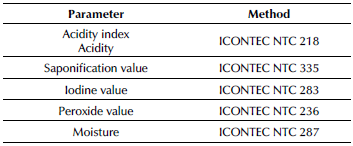 Chemical analysis of extracted fats: The chemical properties were determined through the methodologies described in Table 2.