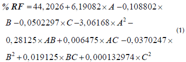 where % RF is the percentage of fat recovery, A is the type of solvent, B is the time, C is the quantity of solvent, and AA, AB, AC, BB, BC, and CC are the interactions between the factors.
