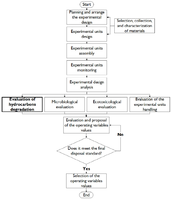 Figure 1 presents the heuristic diagram of the experimental protocol used in the bench-scale experimentation phase. The operating variables of interest for this research only comprised those related to the Evaluation of hydrocarbon degradation stage (highlighted in bold in Figure 1).