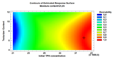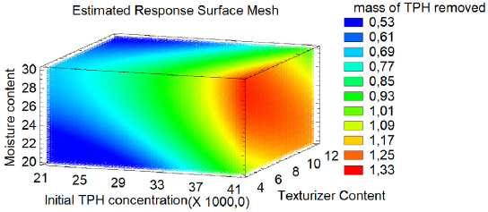 As shown in Figure 2, the highest mass of TPH removed (between 1,17 and 1,33 kg) is found in the region comprised simultaneously by the low and high levels of moisture and texturizer content, along with the high level of the initial TPH concentration.