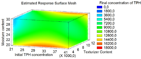 It was remarkable that the statistical analyses and the closeness of the experimental results and model predictions show the reliability of the regression model. The highest mass of TPH removed was obtained in the region defined by the high initial concentration of TPH and the levels from low to high regarding the texturizer and moisture contents. On the other hand, the lowest values for the final TPH concentrations were found in the region defined by the high moisture content factor and the low levels of both the initial TPH concentration and the texturizer content.