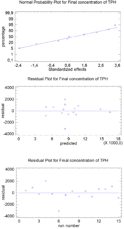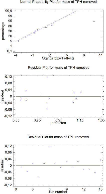 In the individual model of removed mass, the initial TPH concentration (A) was significant. It was also corroborated that it was the factor with the most influence on the response variability. Furthermore, the initial TPH concentration (A) is also significant in the individual model of final TPH concentrations. It is also noteworthy that the effects of factors A and C are greater than that of factor B, given that, when the former are increased, they further modify the variability of the response.
